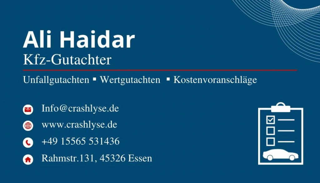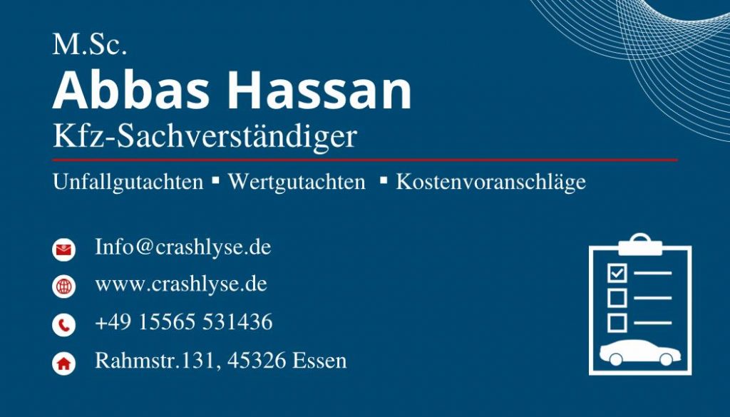 Abbas Hassan ist außerdem geprüfter Sachverständiger für Schäden an Kraftfahrzeugen und deren Wertermittlung (seit 2018).